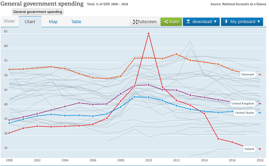 Ireland’s state expenditure in total is about half of most its European partners as a % of GDP. On a global comparison even the US has a bigger % spend than we do! (Although if you strip out the military spending its probably about the same).